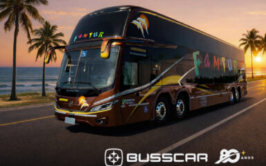 Montado sobre o chassi Scania K500C B8x2, o ônibus tem capacidade para 62 passageiros